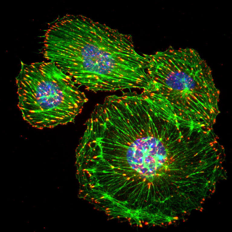 "This is an immunofluorescence stain of brain endothelial cells adhering and spreading on an extracellular matrix primarily made up of fibronectin. The fibers (green) are lines of actin filaments that make up the cell's cytoskeleton and the small dots (red) represent alpha 5 integrin, one of the main receptors of fibronectin, that often localizes in plaques called focal adhesions. Integrins are known to have roles in mediating cell attachment and signaling that helps define cellular shape, cellular mobility, and also regulates cell cycle as well as gene expression."