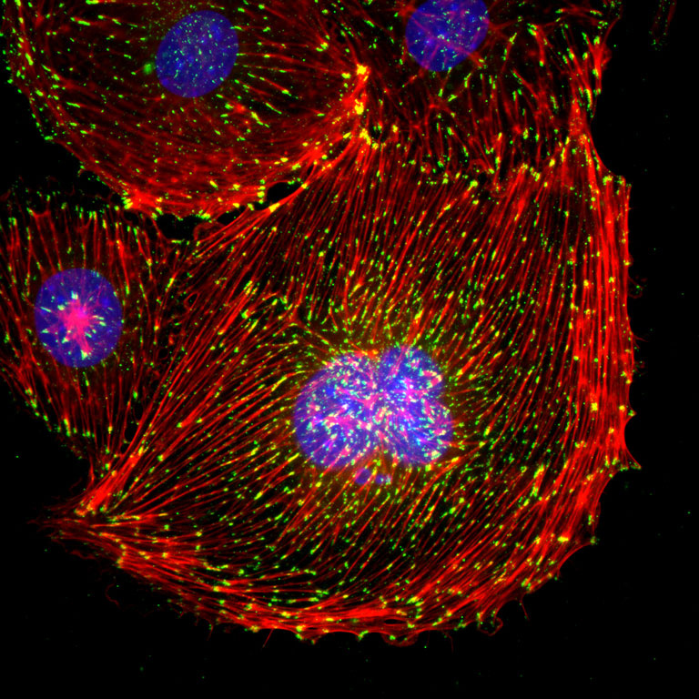 "This is an immunofluorescence stain of brain endothelial cells adhering and spreading on an extracellular matrix primarily made up of fibronectin. The fibers (red) are lines of actin filaments that make up the cell's cytoskeleton and the small dots (green) represent alpha 5 integrin, one of the main receptors of fibronectin, that often localizes in plaques called focal adhesions. Integrins are known to have roles in mediating cell attachment and signaling that helps define cellular shape, cellular mobility, and also regulates cell cycle as well as gene expression."