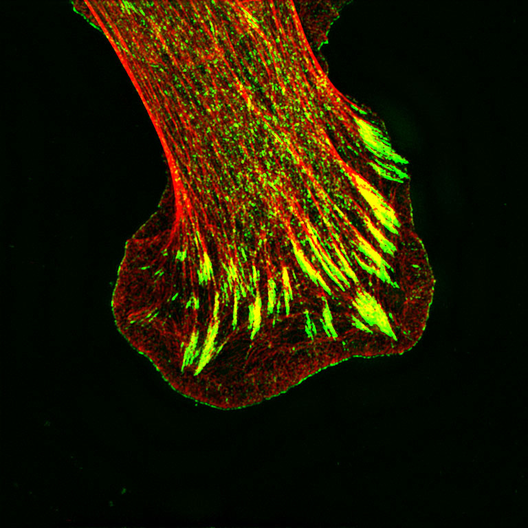 "This image shows a lamellipodium (flat protrusion) of a fibroblast, expressing EGFP-Mena (green) and stained for Filamentous actin (red) to visualize the cytoskeleton. Mena localizes to the tip of the lamellipodium, where actin polymerization occurs. These lamellipodia are very dynamic. You can also see big plaques full of Mena inside the lamellipodium. These are focal adhesions or contacts that are needed for the cell to stick to other surfaces."