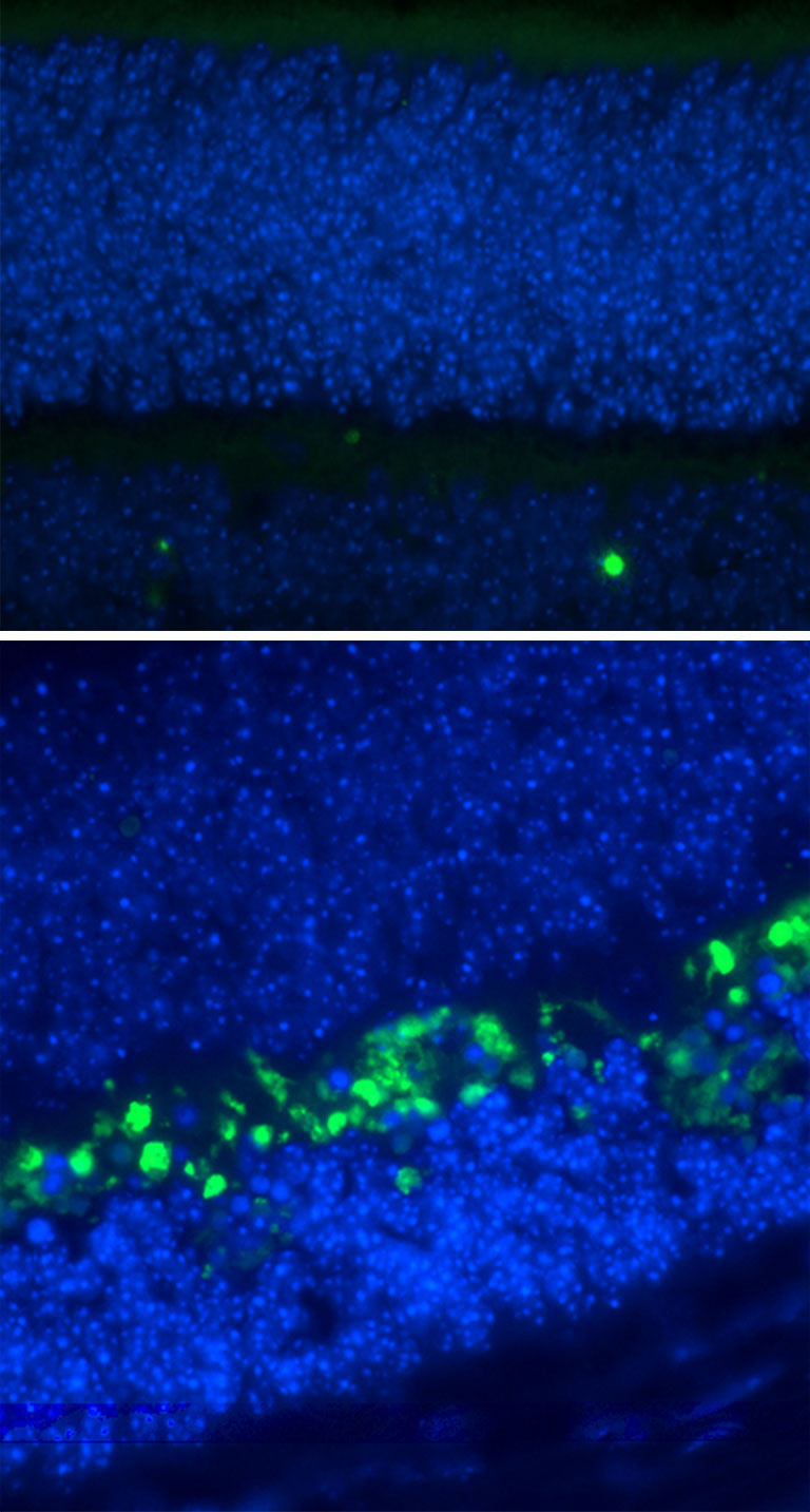 "Vision loss affects more than 3 million Americans and many more people worldwide. Although predisposing genes have been identified their link to known environmental factors is unclear. Shown here is an immunofluorescence picture of retinas isolated 24 hours following treatment with the alkylating agent MMS. TUNEL (green) staining indicates cells undergoing apoptosis (cell death), and DAPI staining illustrates the nuclei of cells. The retina lacking alkyladenine DNA glycosylase (AAG) exhibits no apoptosis (top image). A wild-type retina displays significant apoptosis, specifically in the outer nuclear layer of the retina (bottom image). The image demonstrates that AAG may contribute to alkylating agent-induced retinal degeneration."
