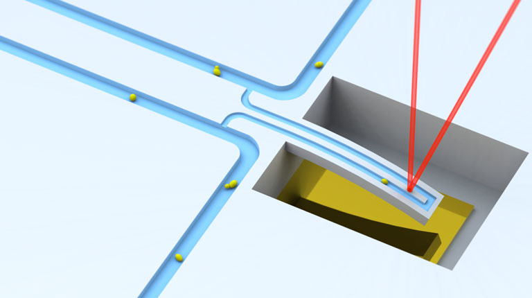 "The image is an artistic rendition of the Suspended Microchannel Resonator (SMR). The SMR is a microfabricated silicon cantilever beam that is packed inside an on-chip vacuum chamber. The SMR has been used to make unparalleled sensitive mass measurements of live cells and its dynamics and is currently being integrated with other biochemical and biomechanical techniques."