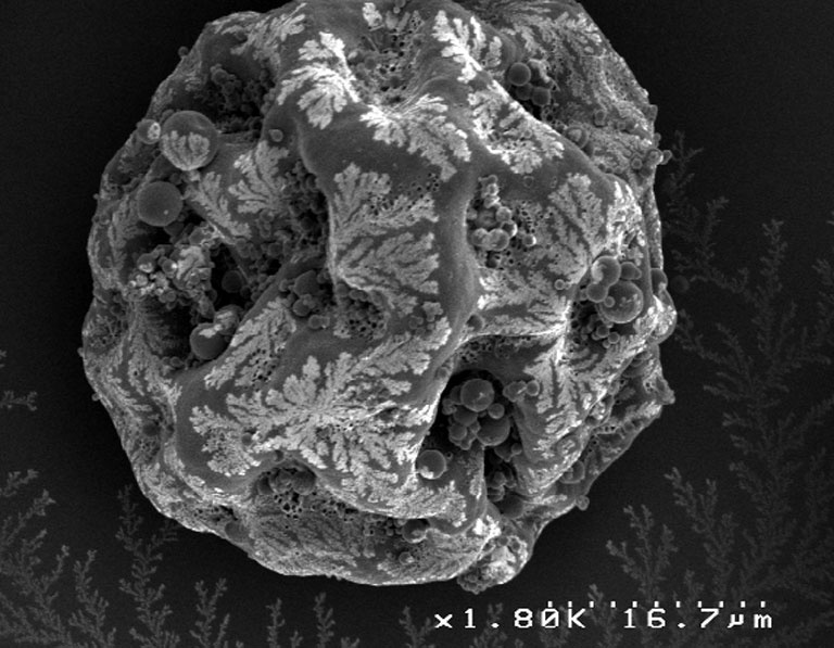 "This image characterizes the release properties of degrading polymer microspheres in phosphate buffer. The pores seen inside and on the surface of the microspheres are important for the release of encapsulated drug, which in this case is a protein. The beautiful crystals seen on the background and on the microsphere surface are formed from the phosphate salts during the drying step used for SEM preparation."