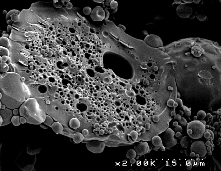 "This image characterizes the release properties of degrading polymer microspheres in phosphate buffer. The pores seen inside and on the surface of the microspheres are important for the release of encapsulated drug, which in this case is a protein. The beautiful crystals seen on the background and on the microsphere surface are formed from the phosphate salts during the drying step used for SEM preparation."