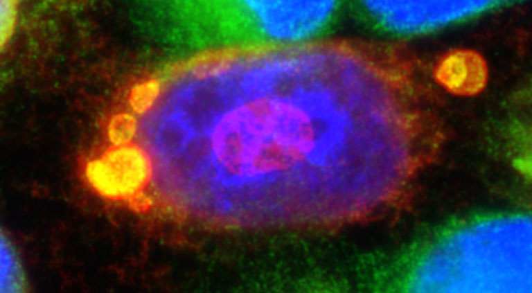 "The endoplasmic reticulum (ER) protein PARP-16 is required for proper organization of the ER of HeLa cells. Here, human HeLa cells that over-expressed PARP-16 were stained for the nucleus (blue), PARP-16 (red) and the endoplasmic reticulum (green)"