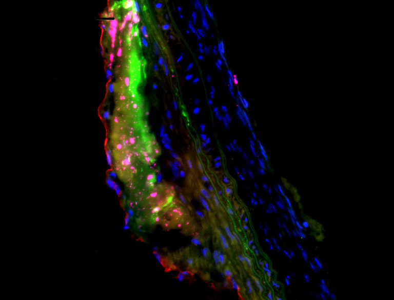 "This image shows the inside of a blood vessel that has been coated with an adhesive hydrogel and nanoparticles. We are using this technology to coat and treat atherosclerotic plaques and other blood vessel diseases."