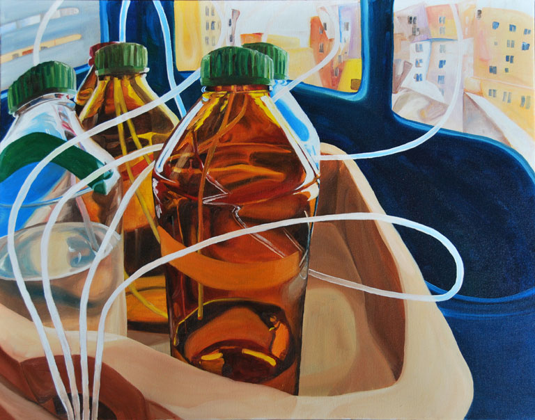 "Cells interpret and respond to information from the outside world (light, hormones, gradients) through a signaling network that involves the placement and removal of chemical groups onto and off proteins. Our lab uses high-pressure liquid chromatography coupled to mass spectrometry to discover how these chemical groups on proteins are changed between healthy and disease conditions. The focus of the picture is the high pressure liquid chromatography instrument. This instrument is crucial to separating pieces of the modified proteins so that they can be analyzed a few at a time by our mass-spectrometer, which accurately measures the protein pieces’ masses, leading to identification and quantification of the protein modifications across different sample conditions. The painting conveys the excitement for the first step of the process. Liquid waits in the HPLC bottles to be pumped through the maze of tubes and to our samples, where it will wash protein pieces into the mass spectrometer for analysis."