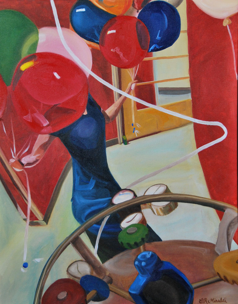 "Positive lab culture fuels scientific discovery. Here, in response to news that our adviser received tenure, we use the mass spectrometry lab’s helium tanks to blow up balloons to fill our adviser’s office. The site of exacting scientific labor becomes the launch ground of a surprise celebration. A post-doc carries balloons out of the laboratory door, which is conveniently propped open by a green test tube rack. Fifty-milliliter-Falcon tubes filled with water serve as balloon weights. A nitrogen tank sits in the foreground, the single white line routing nitrogen gas from the tank, through ceiling, and to a mass spectrometer, which, hidden from view, quietly analyzes signals from cancer cells."