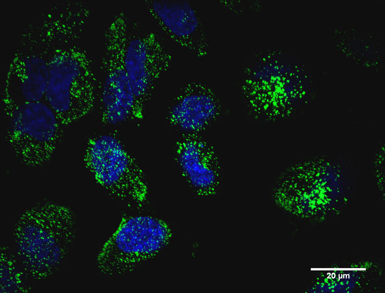 "This image shows polymeric nanoparticles (green) entering cells utilizing endocytosis."