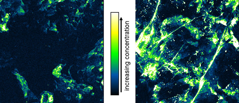 "Nanoparticles have potential as transdermal drug carriers. Compared to traditional topical formulation strategies, drug-loaded nanoparticles offer advantages which include protection of unstable active agents against degradation and prolonged release of active agents. However, the penetration of nanoparticles into the skin is significantly inhibited by the skin’s inherent barrier properties. We applied ultrasound and the surfactant sodium lauryl sulfate (US/SLS) to skin (an FDA-approved method for enhancing skin permeability) to enhance the penetration of nanoparticles into skin, thereby enhancing their potential to serve as transdermal drug carriers. Left: surface of untreated skin after nanoparticle application. Right: surface of US/SLS-treated skin after nanoparticle application."