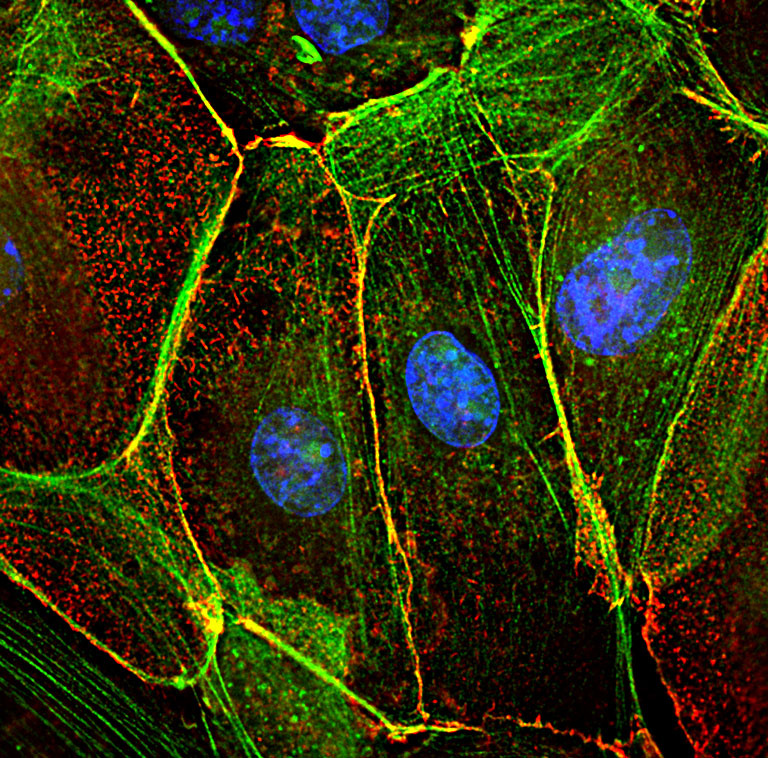 "This picture shows the requirements of an active actin cytoskeleton remodeling during cell-cell junction formation, a basic biological process that will give rise to a functional epithelium, for example the skin. These cells are indeed keratinocytes (skin cells) that are stimulated to form cell-cell junctions in vitro. In green is the filamentous actin cytoskeleton (F-actin) while in red are labeled the sites of active actin remodeling in the cells, visualized by the use of red-labeled globular-Actin (G-actin), incorporated in the cells while they are still live. Blue is the DNA in the nuclei.