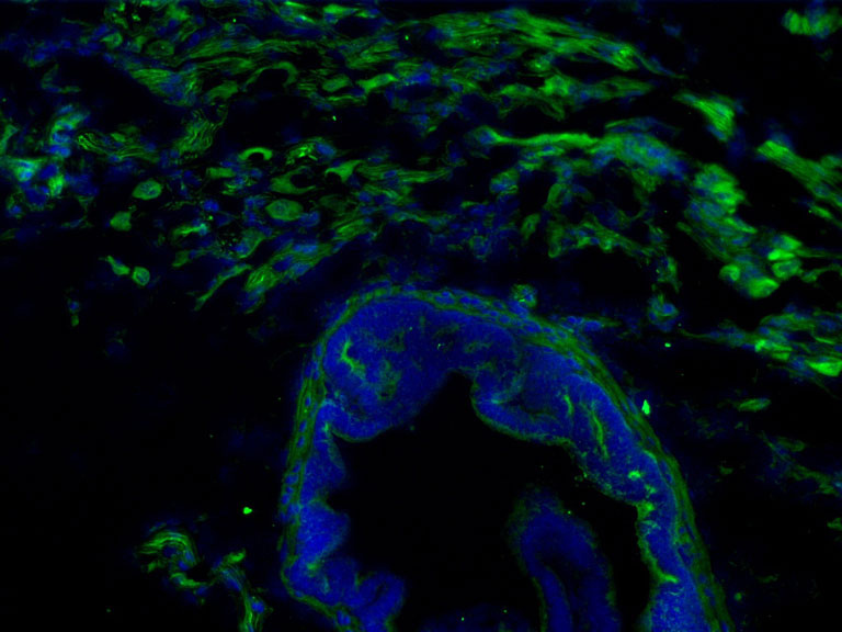 "This image shows neoplastic prostate lobes from a mouse surrounded by reactive stroma (green). We are interested in the microenvironment that follows progressing tumors and how that changes as treat the tumors with cancer specific T cells. The stromal microenvironment plays important roles in the development of treatment resistant tumors. Visualizations like these help us define the stromal elements and their contribution to treatment resistance."