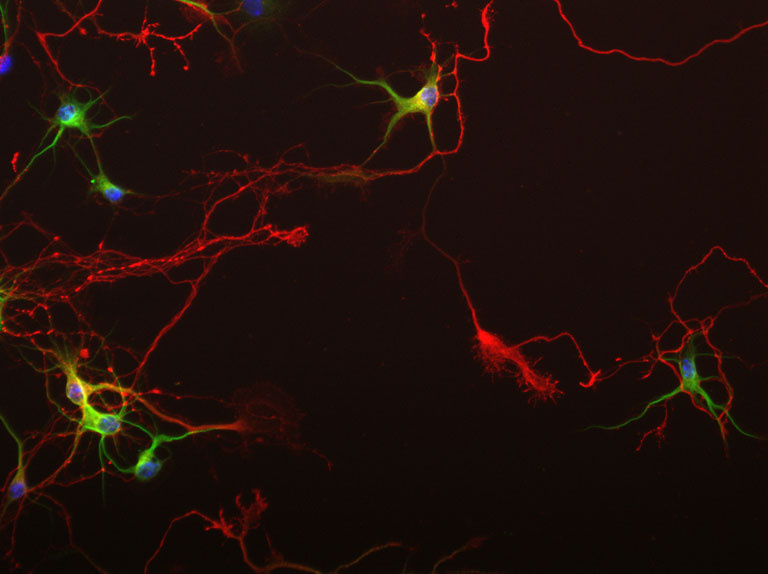 "This image was taken from a series of optimization experiments, designed to determine how best to miniaturize, visualize and analyze synaptic and dendritic structures in primary neurons grown in optical 96-well plate formats and imaged by automated epi-fluorescent microscopy. In the image, seven day-old dissociated hippocampal neurons show simple, immature dendritic arbors (green) extending from neuronal cell bodies together with long pathfinding axons with large growth cone heads (red) when grown in optical 96-well plates."