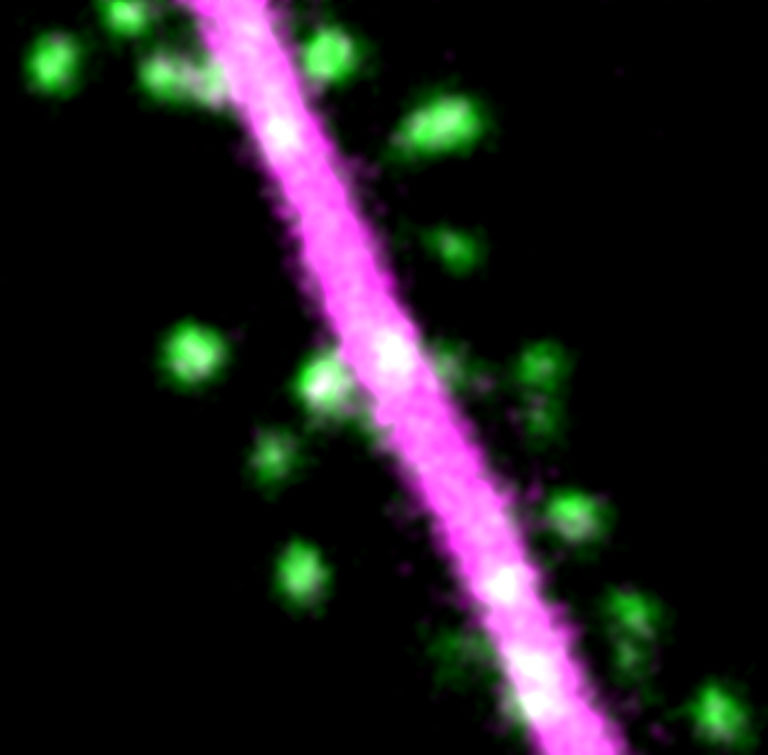 "This is a two-photon microscopy image of a live rat hippocampal neuron transfected with DsRed2 to visualize the dendrite (magenta) and co-transfected with GFP-CaMKII-beta (green) to highlight the structure and dynamics of dendritic spines.