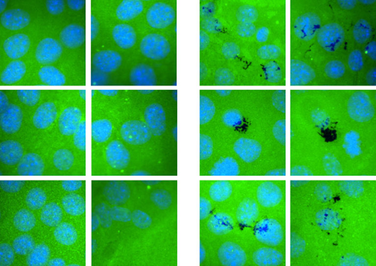 "These images show that cancer cells can behave differently in terms of their ability to degrade their surrounding tissues. In these images, invasive (right) and non-invasive (left) lung cancer cells are cultured on a green fluorescently labeled extracellular matrix, but only the invasive cells are able to degrade the matrix, leaving behind focal black patches. I was very excited when I first saw these images with my eyes through the microscope, as I was starting my project as a new graduate student in the lab. The difference between the invasive and non-invasive cells is dramatic. I am currently studying the molecular mechanism that differentiates the invasiveness of these cells."