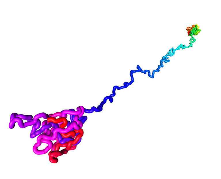 "The fractal globule is a particular shape adopted by some polymers, such as DNA, that has a number of interesting properties. Fractal globules are very dense, yet completely unknotted and capable of undergoing local unfolding behaviors. This image was created as part of a simulation used to understand the dynamics of how these fractal structures are formed. Understanding how the globules form and how robust they are to various topological alterations allows us to make similar predictions about DNA."