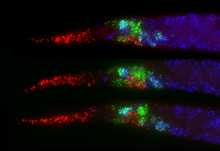 "This image shows three different types of single mRNA molecules (red: lin-44, green: egl-20, blue: cwn-1) in the posterior body of C. elegans worm hatchlings. The image was taken to quantitatively map the expression patterns of Wnt genes during post-embryonic development of C. elegans. Wnts are morphogens that controls a number of developmental processes such as cell growth, migration and induction of cell fates."