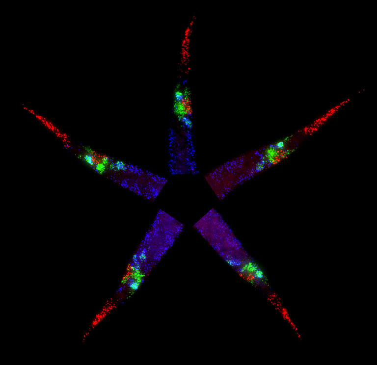 "This image shows three different types of single mRNA molecules (red: lin-44, green: egl-20, blue: cwn-1) in the posterior body of C. elegans worm hatchlings. The image was taken to quantitatively map the expression patterns of Wnt genes during post-embryonic development of C. elegans. Wnts are morphogens that controls a number of developmental processes such as cell growth, migration and induction of cell fates. Each animal was re-arranged so that the tails are pointing outwards."