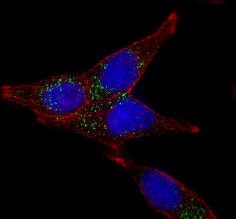 "The subjects of the image are prostate cancer cells that express the prostate-specific membrane antigen (PSMA) receptor. Nanoparticles, labeled with a green dye, have been surface-modified with an antibody fragment that targets the nanoparticles to the PSMA receptor on the cell surface. The larger goal of this research was to develop a nanoparticle delivery system able to treat prostate cancer. The nanoparticles were engineered to target PSMA, which is overexpressed by prostate cancer cells. The nanoparticles would be loaded with a chemotherapeutic agent to kill the cancer cells once they were internalized by the cells. This image shows that the nanoparticles were able to target PSMA-positive prostate cancer cells, which was the first step in the project.