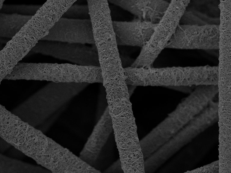 "This image shows multilayer films of functionalized nanotubes on electrospun fibers. I took this image because I wanted to examine morphology and uniformity the CNTs films on individual electrospun fibers. The image shows the conducting membrane that will be used as a sensing element to detect toxic chemical gas."