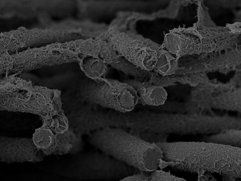"This image shows multilayer films of functionalized nanotubes on electrospun fibers. I took this image because I wanted to examine morphology and uniformity the CNTs films on individual electrospun fibers. The image shows the conducting membrane that will be used as a sensing element to detect toxic chemical gas."
