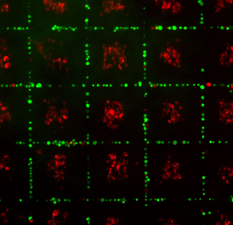 This image depicts a new three dimensional multi-cellular patterning strategy for engineering three-dimensional tissues. Rat hepatocytes and fibroblasts (red) are patterned within an endothelial cell lattice (green) with precise spatial control."