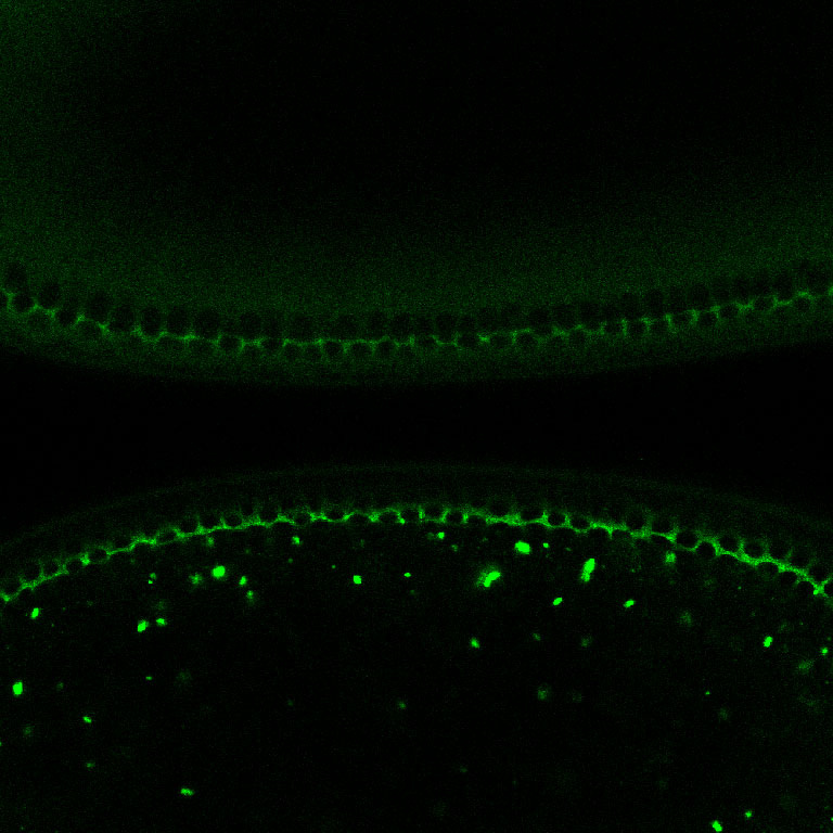 "This image shows cellularization -- the event just before ventral furrow formation in Drosophila melanogaster embryo development. During celullarization the cell membrane forms apically around the syncytial nuclei and extends down towards the basal ends of the cells. In this image there are two embryos: the embryo on top has a wild-type version of the myosin regulatory light chain (RLC) tagged with GFP while the bottom embryo has a constitutively active version of the RLC tagged with GFP. I took the image to see if mutations to the RLC had effects on the embryo's development before the ventral furrow."