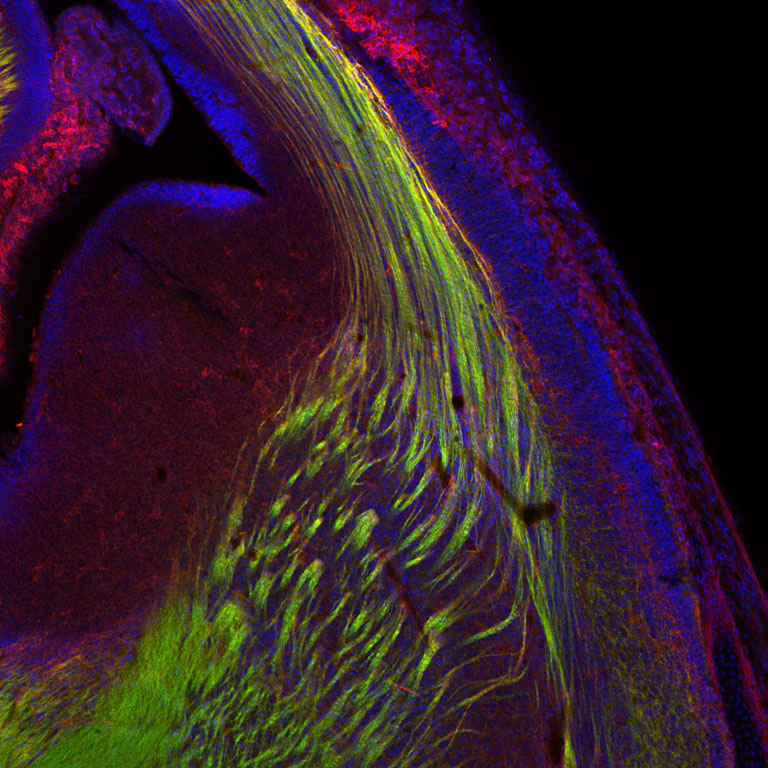 "I took this image to visualize the axons connecting the cortex to other structures of the nervous system. I am interested in the development of the nervous system, and axon guidance is a crucial part of this process during embryogenesis. Axons that connect individual parts of the nervous system transmit environmental stimuli to the brain, and responses from the brain to the rest of the body. Thus, their proper development is essential for the formation of a functional nervous system."