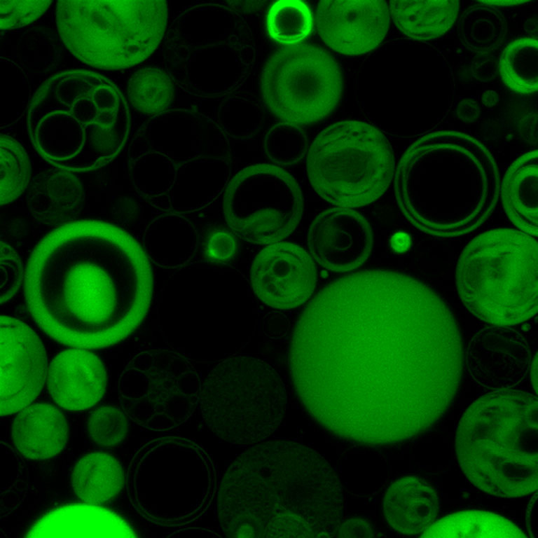 This image shows giant multilamellar lipid membranous vesicles made with fluorescent cholesterol.