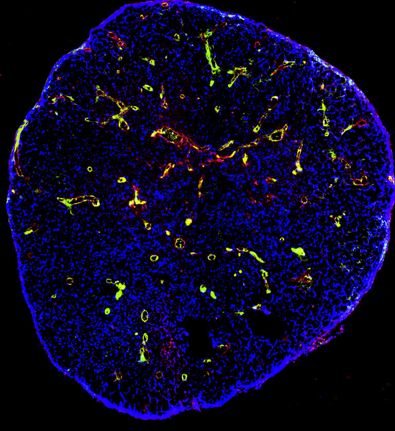 "Solid tumors often receive a very small percentage of toxic chemotherapies when these therapies are delivered intravenously. To enhance this delivery, we are using nanosized particles called gold nanorods. Gold nanorods accumulate in the tumors and when exposed to near infrared light, they generate heat locally inside the tumor. By altering the tumor's blood flow and vascular wall properties, localized gold nanorod heating can improve the delivery of therapeutic cargoes to their intended target. Here, a drug surrogate (green) is shown to reach many tumor vessels (red) in a clinical model of ovarian cancer receiving gold nanorod therapy."