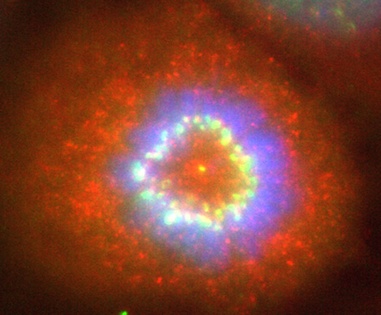 "This image demonstrates a cell in the dividing process, also known as mitosis. When a cell segregates its chromosomes (DNA) into the daughter cells, it must first align the chromosomes in a straight line also known as the metaphase plate. You can picture the metaphase plate as a drinking straw. In this beautiful image, although the cells do not look to be in a straight line, they actually are and instead of looking at them from the outside, you are looking at them through the center of the metaphase plate. This would be similar to looking through the center of the drinking straw. In this case, the chromosomes are shown to be in a perfect circle. The red and green colors (shown as yellow) are the center of each chromosome pair (prior to dividing one chromosome into each daughter cell), while the entire chromosome is shown in blue. We were curious to see if molecular motor proteins (CenpE) mislocalized in cancer cells."