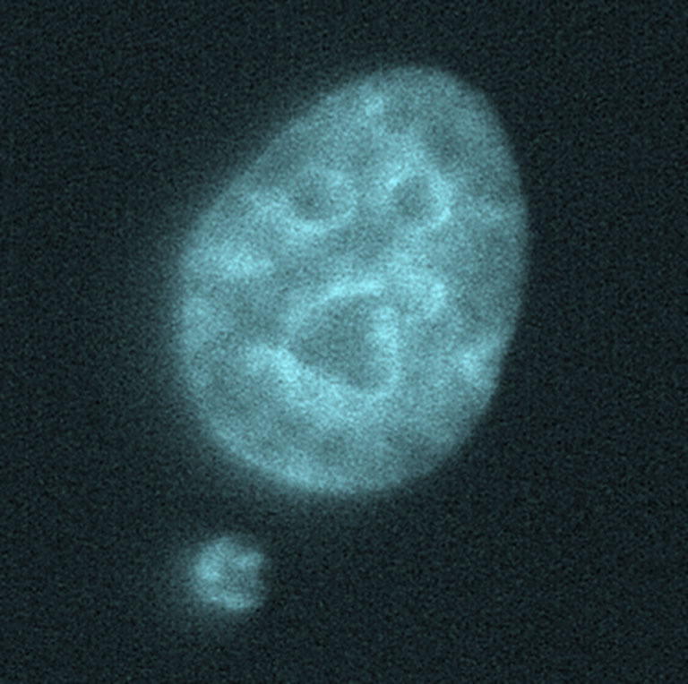 "This is a cell in interphase, the stage where cells grow, take up nutrients, and duplicate their DNA. The blue staining is the nucleus and is staining the DNA. Inside of the nucleus are nucleoli that contain many proteins and nucleic acids that play a role in transcribing ribosomal RNA. I was studying mitosis and staining cells with DAPI to identify the mitotic index by microscopy. During this time, I came across this interphase cell where the nucleoli resemble a set of eyes and a mouth. To me this cell seems as if it has a scared face."