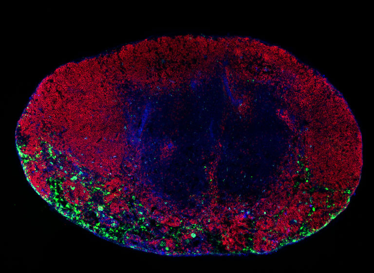 We are investigating whether Alexa-fluor647 labeled nanoparticles with surface conjugated DQ-OVA (BIODIPY), a protein that only fluoresces upon cleavage during antigen presentation, localize and are able to present loaded antigen in areas of the lymph node that are enriched with naive B and T cell, indicating opportunity for antigen-specific activation."