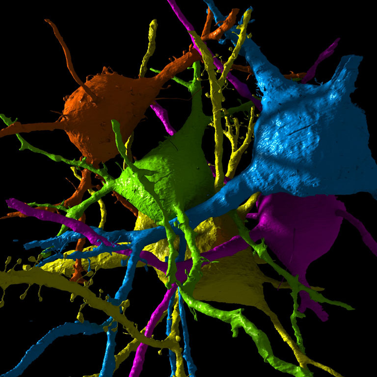 "Our images show 3d renderings of neurons and parts of neurons which were reconstructed from electron-microscopic images of a very large stack of slices of mouse somatosensory cortex. This particular image shows renderings of five cell bodies labeled from our electron-microscopic image stack in their actual relative location with all their branches. Some are spiny pyramidal cells, others are aspiny interneurons. The colors are all arbitrary since the EM images do not show color."