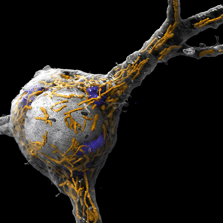 "Our images show 3d renderings of neurons and parts of neurons which were reconstructed from electron-microscopic images of a very large stack of slices of mouse somatosensory cortex. This particular image shows the cell body of a neuron in mouse somatosensory cortex, with its nucleus (white), mitochondria (orange), Golgi apparatus (blue) and lysosomes (black) labeled. The endoplasmic reticulum is not shown. Labeling the organelles of a cell enables us to better understand their shape and spatial distribution within the cell. The colors are all arbitrary since the EM images do not show color."