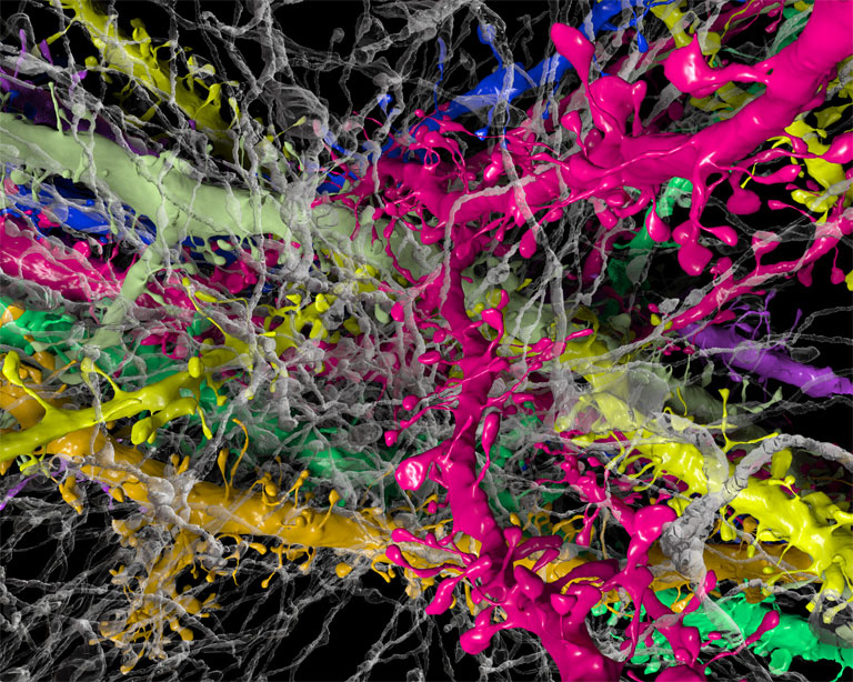 "Our images show 3d renderings of neurons and parts of neurons which were reconstructed from electron-microscopic images of a very large stack of slices of mouse somatosensory cortex. This particular image shows a number of spiny dendrites in color and axons synapsing on them as semi-transparent objects. The dendrites run in a bundle, a so-called ‘cortical minicolumn’, up to the surface of the brain (horizontal in this image). They receive inputs from numerous axons at synapses, many of them on spines. The colors are all arbitrary since the EM images do not show color."