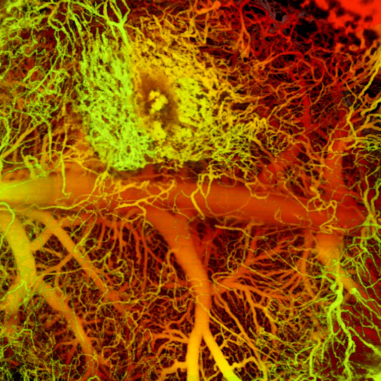 "This project focuses on studying tumor angiogenesis. We study the roles of different proangiogenic proteins in the development of abnormal tumor vasculature. Images like these help us quantify the size, shape, and number of vessels in a tumor and how these parameters change after various interventions. This image shows the vasculature of a developing glioblastoma, 8 days after it was implanted into the brain of a normal mouse.