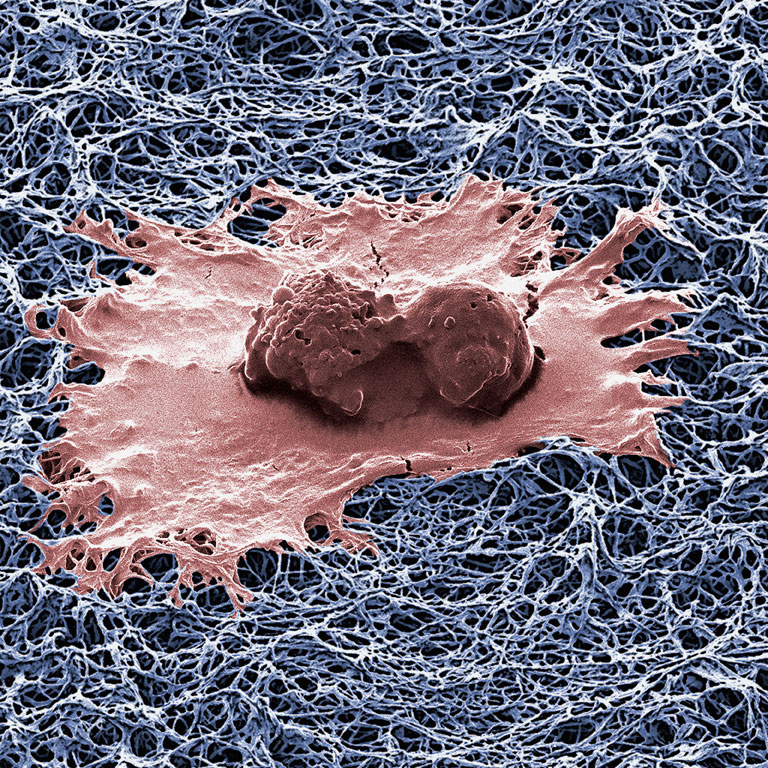 "This image shows a human breast cancer cells (red color) spreading over a porous and texturized polymeric surface (blue color). This cell is supported on nanofibers of an electrically conducting plastic serving as a scaffold for probing cellular growth. These nanofibers can puncture a cell and can be used to inject them with a variety of chemicals that are capable of killing them.