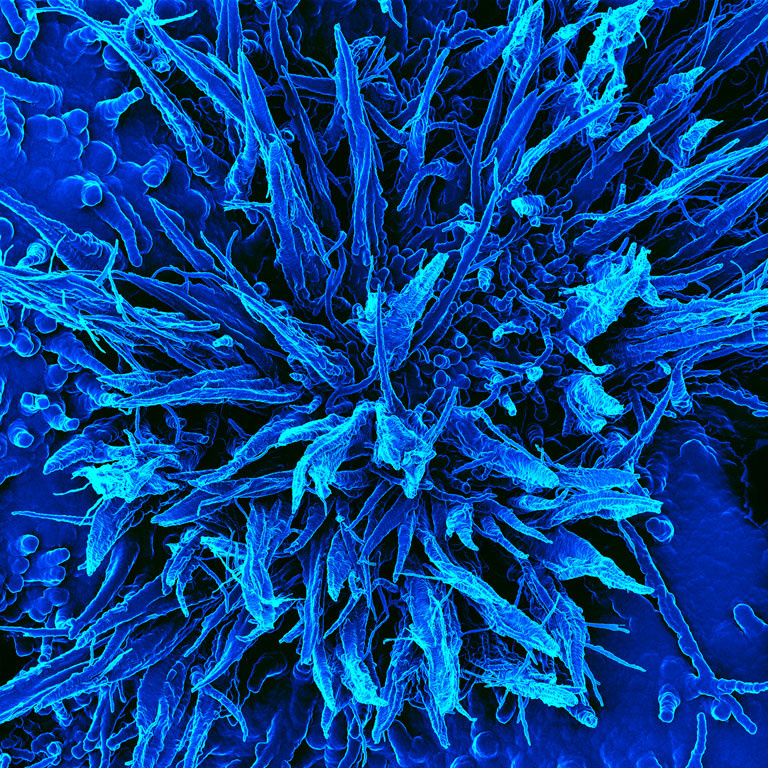 "This image shows electrically conducting plastic nanofibers that can serve as a scaffold for probing cellular growth. These nanofibers can puncture a cell and can be used to inject them with a variety of chemicals that are capable of killing them. I collected this image in order to study the interaction between a porous polymeric nanofibrillar surface and human cancer breast cells. [It is] part of subset of experiments geared towards discovering biological applications for conducting polymer nanofibers."
