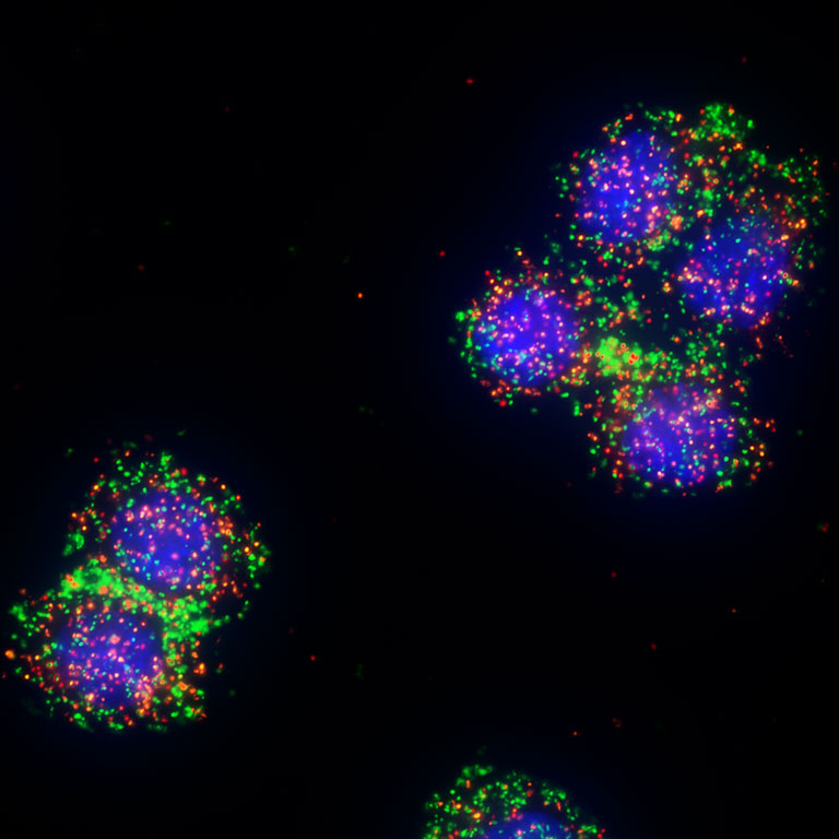 This image represents the simultaneous detection of three receptor complexes (red, orange, and green) on individual breast cancer cells (blue) using a novel detection platform. Each colored spot indicates the presence of a distinct receptor complex. The use of this approach to measure multiple receptor complexes on human cancer specimens may allow scientists to better understand which patients are likely to respond to a particular therapy and help guide clinical treatment decisions."