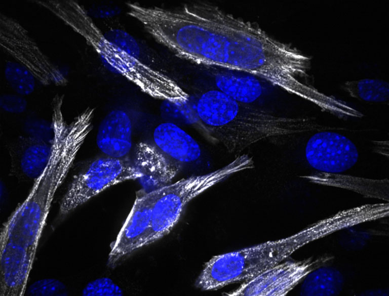 "This image depicts the beginning stage of skeletal muscle differentiation. Cells are starting to fuse together (mostly two nuclei per cell at this stage) and starting to express the myogenic differentiation marker alpha-actinin (white). Nuclei stained with DAPI (blue). This image showed successful in vitro skeletal muscle differentiation protocol."