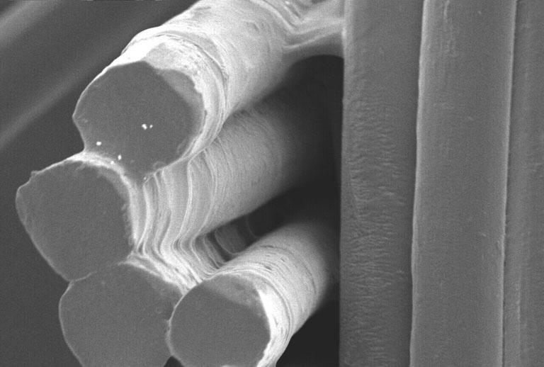 "These are three high magnification (SEM) images of biocompatible plastic filaments (PCL polymer) coated with a thin layer of bone inducing gel (melanic hydrogel). We had this great 3-dimensionally woven polymer fiber that was very biocompatible and strong enough to withstand a lot of compression and tension like bone. We also recently developed a hydrogel that produced some amazing pro-bone matrices but was very weak being a gel. We wanted to know if we could coat the polymer fiber mesh with this hydrogel and have it bind well in a thin enough layer.