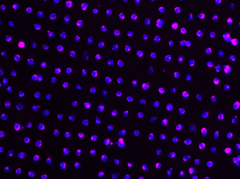 Liver cells (blue) that have been freshly isolated from the body are attached to a patterned surface, where they are encouraged to form clusters with supporting cells (pink) that rescue their liver function.
