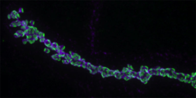 "Our lab is interested in studying molecular mechanism of synaptic transmission and morphology. This image shows a Drosophila motor neuron synapsing onto a muscle (in the plane of the screen). It was taken while studying a knockout animal disrupted in NHE3, a gene recently linked to autism spectrum disorders that we are studying in the lab. The surface of the neuron is colored red. In green are glutamate receptors expressed on the muscle that detect neurotransmitter release from the neuron. The resolution of the image allows you to see individual sites of synaptic vesicle release and detection peppering the surface of the neuromuscular junction."