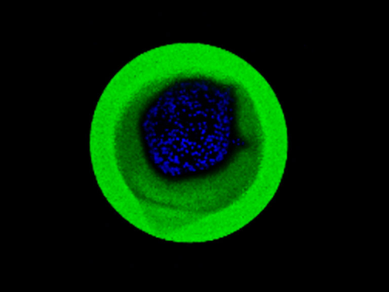 "Insulin producing pancreatic islet cells (Blue) are encapsulated in small packages of alginate capsules (Green) for transplantation in diabetic animal models. These packages prevent any immune response from the host as their antibodies cannot recognize the healthy pancreas hidden beneath the capsule and insulin a key hormone for glucose metabolism can slowly release from the capsule. This is a top 3D view of these capsules which show excellent encapsulation and have shown high efficiency in curing mice with diabetes."