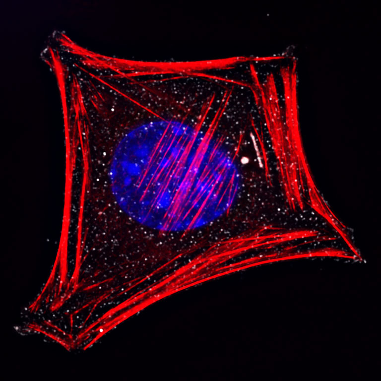 "I am studying various types of cytoskeletal protrusions formed by the cancer cells. Aggressive mouse mammary carcinoma cells (D2A1) were grown on top of a thin gelatin film and stained for the actin cytoskeleton (filamentous actin [F-actin]; red), an actin-binding protein cortactin (white) and the nucleus (by DAPI; blue). These cells developed spots containing F-actin and cortactin, which represent sites where these cells degrade the underlying layer of gelatin film. I aimed to figure out the gelatin degrading/invading ability of the D2A1 cells. This image demonstrated that the D2A1 cells can form actin-rich, cortactin-positive protsuions that invade into the layer of gelatin, which are usually called as ‘invadopodia’.