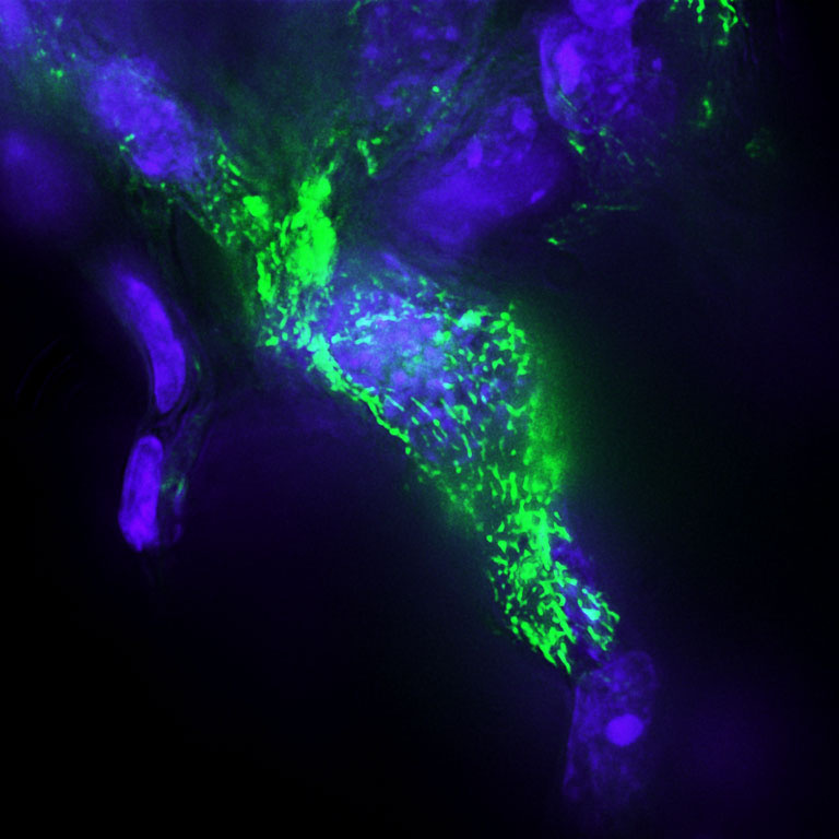 "I am studying the cell-biological behavior of cancer cells after metastatic dissemination into foreign tissues. Aggressive mouse mammary carcinoma cells (D2A1) were engineered to express a fluorescent fusion protein containing integrin alpha5 (green). These cells were injected into mice through the tail-vein and allowed to disseminate within the lung tissue. The formation of abundant, integrin alpha5-containing plaques indicated that the D2A1 cells can interact with the extracellular matrix components of the lung parenchyma in a way enabling the activation of adhesion-associated signaling events."