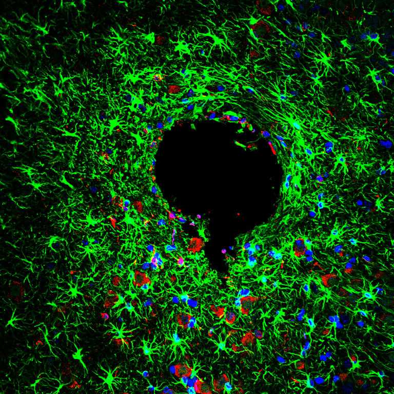 "Our lab is working to develop chronic delivery devices that are capable of treating neurologic disorders in the brain [by] releasing drug for extended periods of time. Such a device must operate effectively in the presence of any biological response to the device. This image depicts the brain’s response to an implanted drug delivery device that has been implanted for four weeks (device was implanted where the hole in seen in the picture). At this point, astrocytes, a support cell of the brain, forming a fibrous capsule around the implant, commonly referred to as glial scar. The goal of this experiment was to examine the biological response the materials (PEG coated borosilicate glass) used in our device."