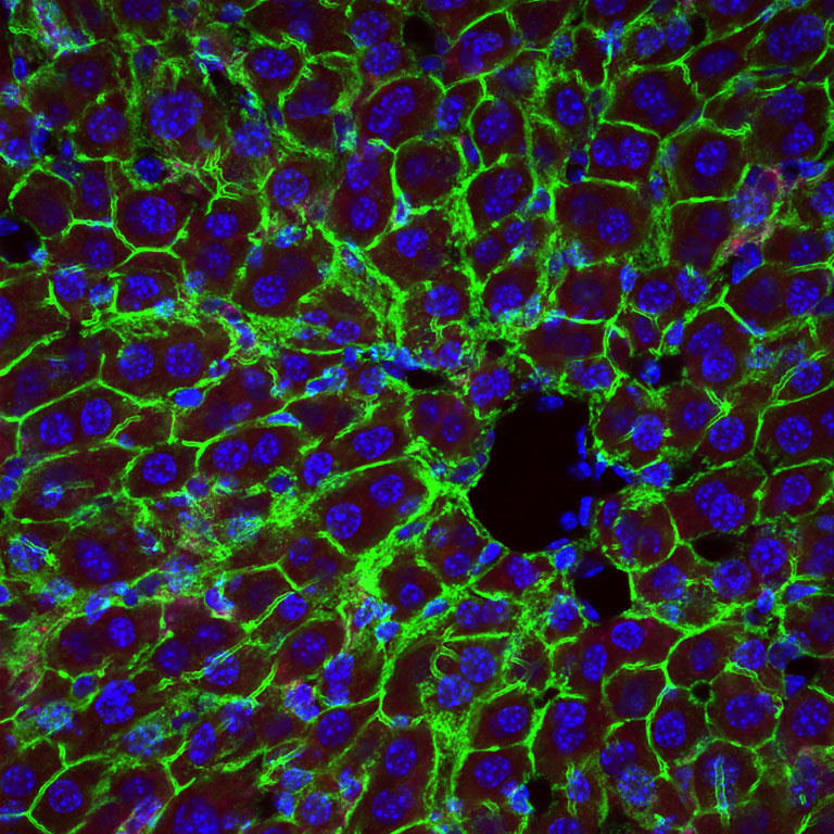 The image shows delivery of nanoparticles loaded with therapeutic biological molecules to the liver of mice. In the image the nanoparticles are shown in red, Liver cells are shown in green, and cell nuclei are shown in blue. Delivery of therapeutic biological molecules is major barrier to their efficacy and our lab devotes a considerable amount of effort towards developing more effective nanoparticles that facilitate drug delivery specifically to cancer cells. In this experiment the goal was to confirm whether the nanoparticles could be delivered to mice livers.
