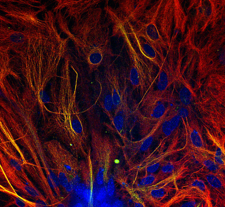 "This is an image of mouse brain cells cultured on a plastic coverslip and then stained with fluorescent antibodies. [It] was taken as part of a larger autism study in which I was attempting to determine the subcellular localization of a particular autism-related protein. [The] image indicates that the autism-related protein of interest may be expressed in glial cells, which are the support cells of the brain."