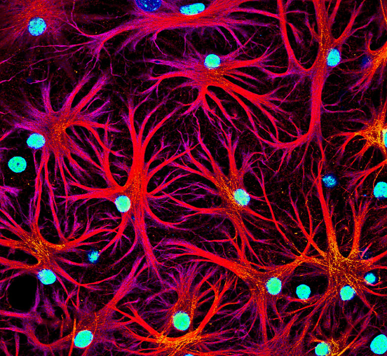 "This is an image of mouse brain cells cultured on a plastic coverslip and then stained with fluorescent antibodies. [It] was taken as part of a larger autism study in which I was attempting to determine the subcellular localization of a particular autism-related protein. [The] image indicates that the autism-related protein of interest may be expressed in glial cells, which are the support cells of the brain."
